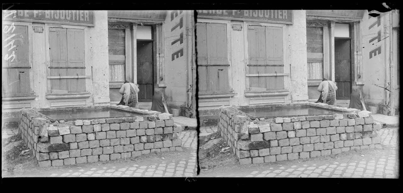 - Dans Reims, l'hôtel de ville est en ruine quelques mois après l'incendie qui dévasta le bâtiment. Au coin d'une rue, une affiche appelle les Français à souscrire au 3e emprunt national. Des réserves d'eau ont été installées par les sapeurs-pompiers.