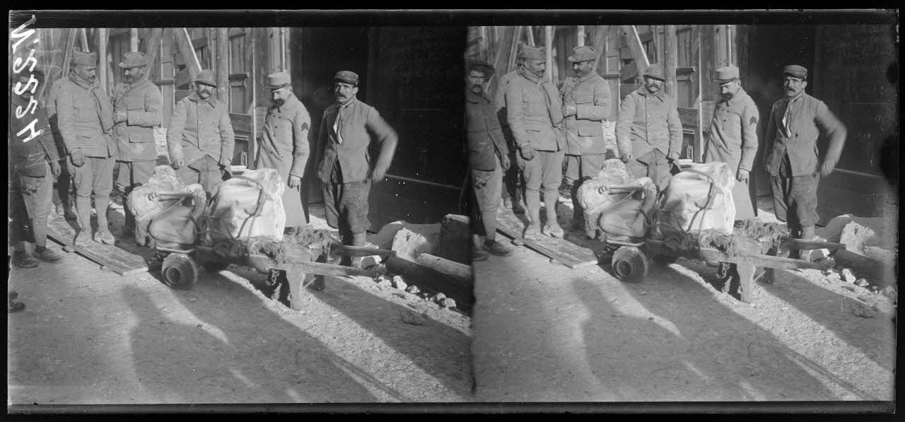Jonchery-sur-Vesle (Marne). Groupe de secrétaires d'état major de la 20e section devant leur réfectoire (janvier 1918).