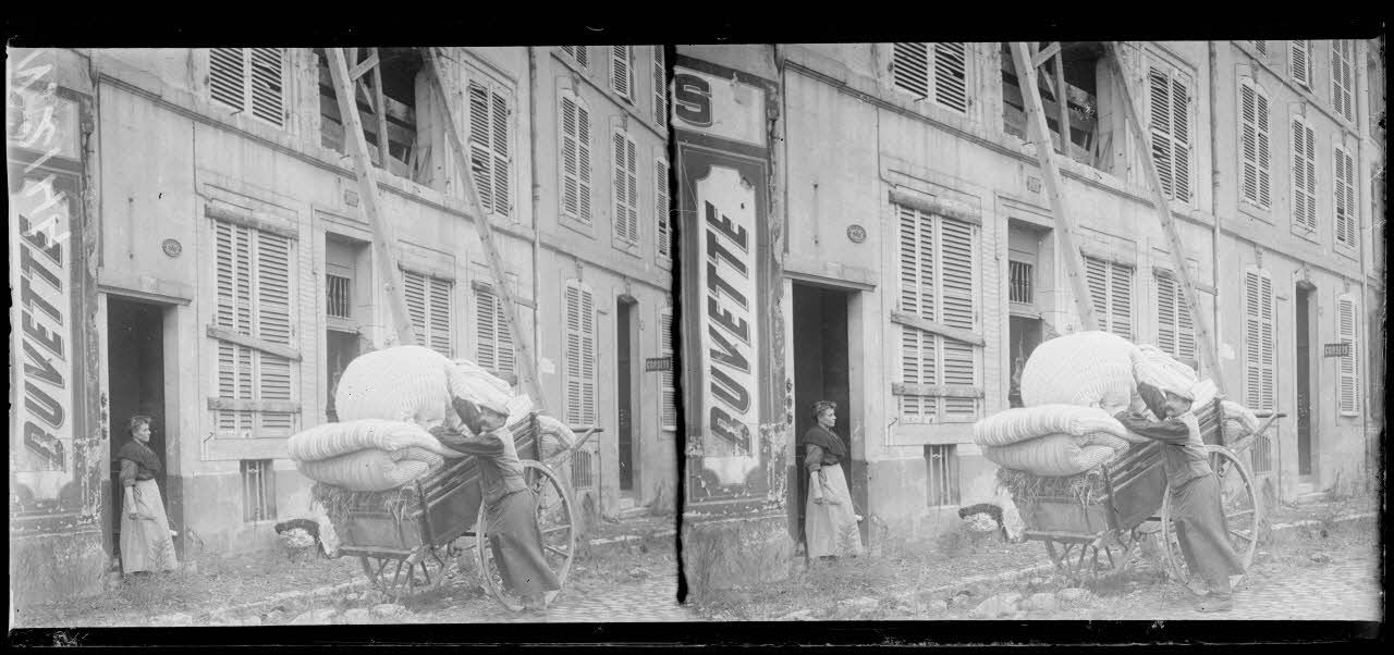 - Dans Reims, l'hôtel de ville est en ruine quelques mois après l'incendie qui dévasta le bâtiment. Au coin d'une rue, une affiche appelle les Français à souscrire au 3e emprunt national. Des réserves d'eau ont été installées par les sapeurs-pompiers.