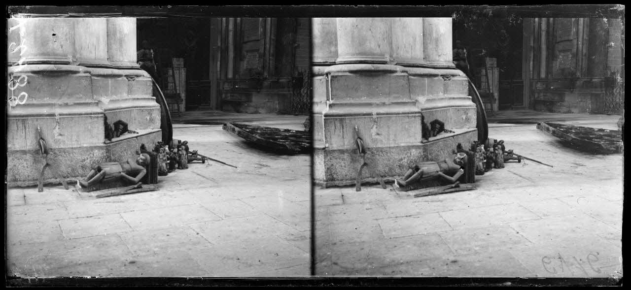 Reims, mission américaine de Miss Holt. A la cathédrale, les personnages de la grande horloge prêts à être expédiés à Paris. [légende d'origine]