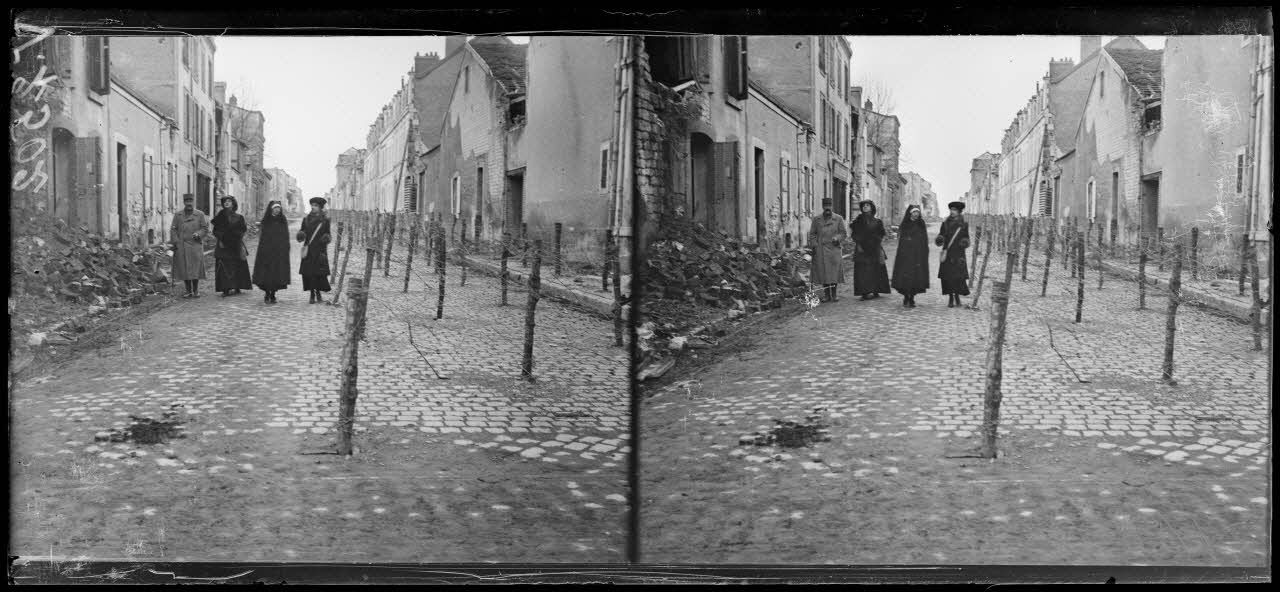 - Dans les rues de Reims (06/03/1918, V 2502 à V 2506) la mission américaine arpentent les rues détruites et sillonnent les tranchées creusées.