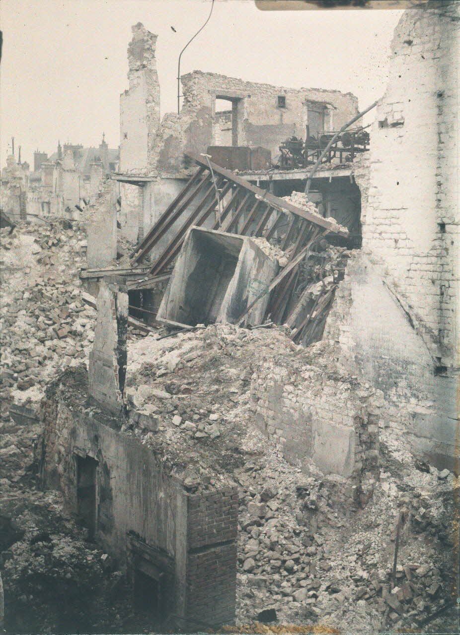 - les ruines et destructions occasionnées par la guerre à Verdun, Reims, Arras ou ailleurs : maisons, églises, cathédrales, lieux symboliques des grandes villes de province en ruines ;