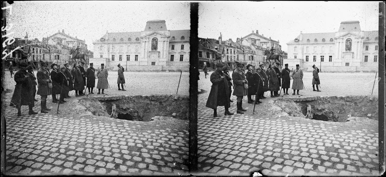Reims. Visite d'une mission canadienne. La mission Place du Parvis, au 1er plan : trou d'obus. [légende d'origine]