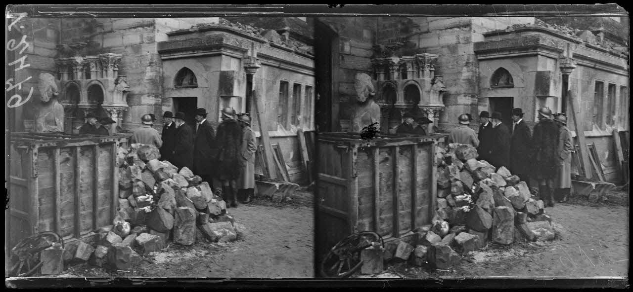 - Devant la cathédrale de Reims (04/03/1918, V 2482), M. Lafferre découvre la cathédrale et son chantier de protection et de conservation dirigé par l'architecte M. Sainsaulieu (V 2477 et V 2478). M. Luçon, cardinal de Reims, accompagne le ministre dans les ruines de la salle de Tau (V 2475). Paul Léon, directeur du service de l'architecture, accompagne M. Lafferre à la fin de sa visite de la cathédrale (V 2481 et V 2482).