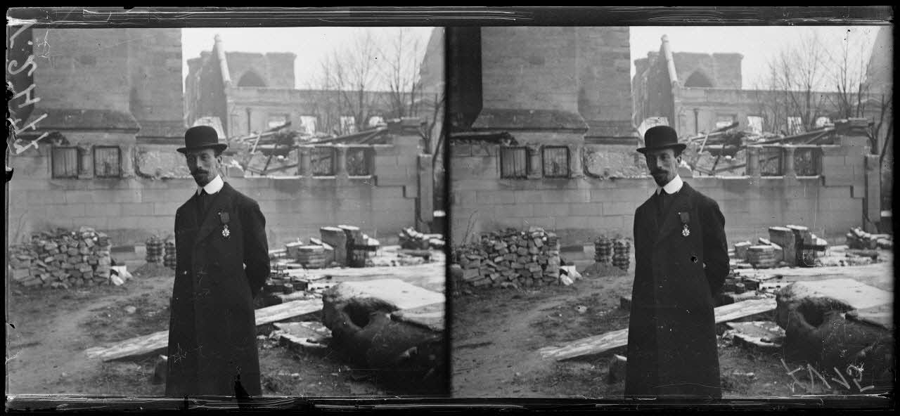 - Devant la cathédrale de Reims (04/03/1918, V 2482), M. Lafferre découvre la cathédrale et son chantier de protection et de conservation dirigé par l'architecte M. Sainsaulieu (V 2477 et V 2478). M. Luçon, cardinal de Reims, accompagne le ministre dans les ruines de la salle de Tau (V 2475). Paul Léon, directeur du service de l'architecture, accompagne M. Lafferre à la fin de sa visite de la cathédrale (V 2481 et V 2482).