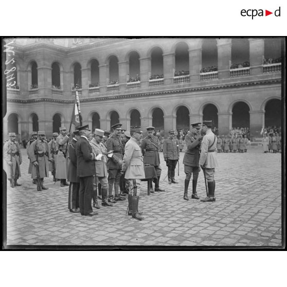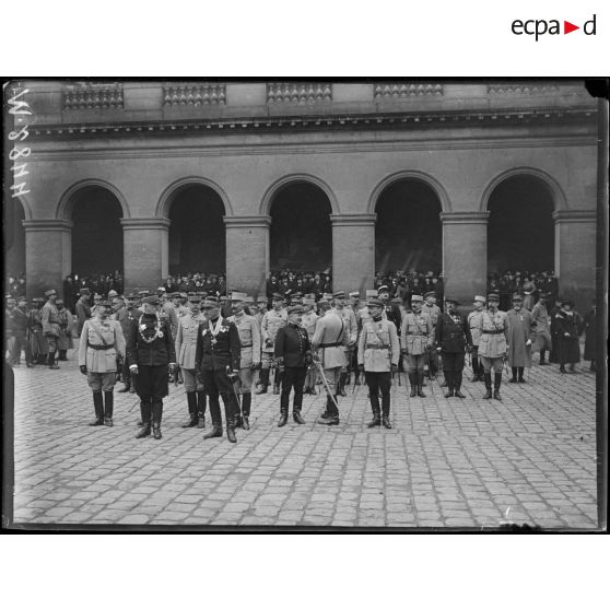 Remise aux Invalides des décorations anglaises par le prince de Connaught. Groupe d'officiers à décorer écoutant l'hymne anglais.