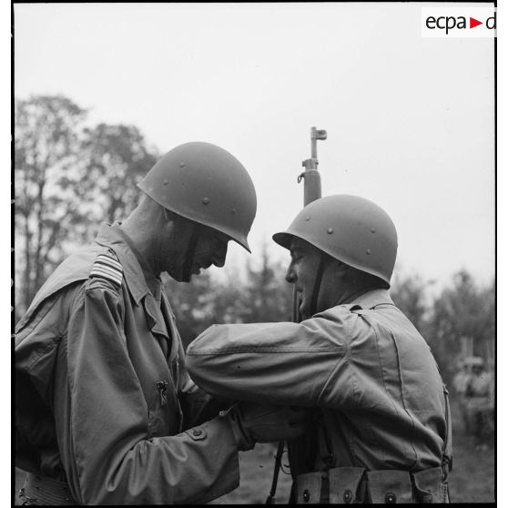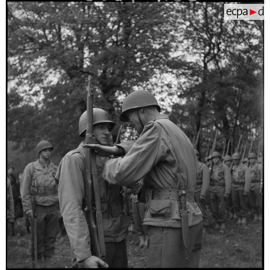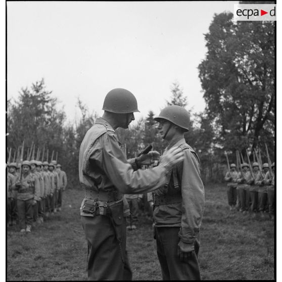 Le colonel Demetz procède à la lecture des citations à l'unité, alignée devant lui. Il remet ensuite sa décoration à chaque récipiendaire tout en " adressant à chacun quelques paroles amicales " précise la légende d'origine.