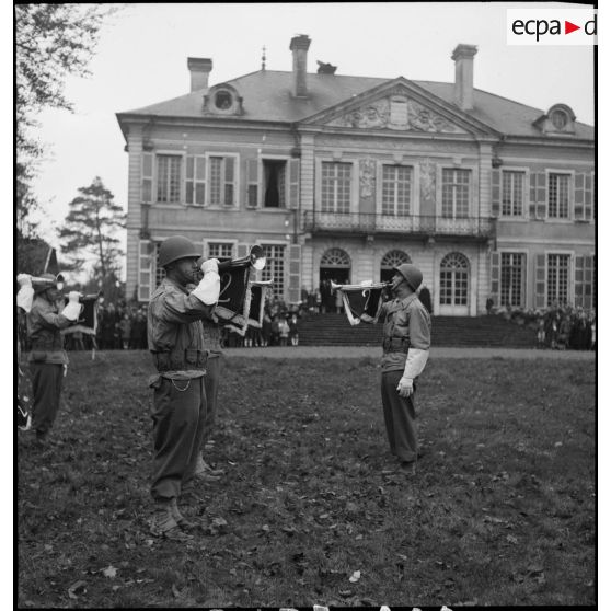 Prise d'armes au 2e RD (régiment de dragons) dans le parc d'un manoir le 5 novembre 1944.