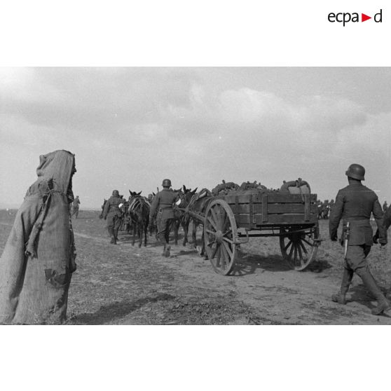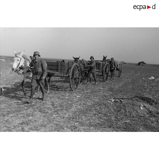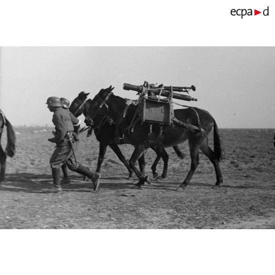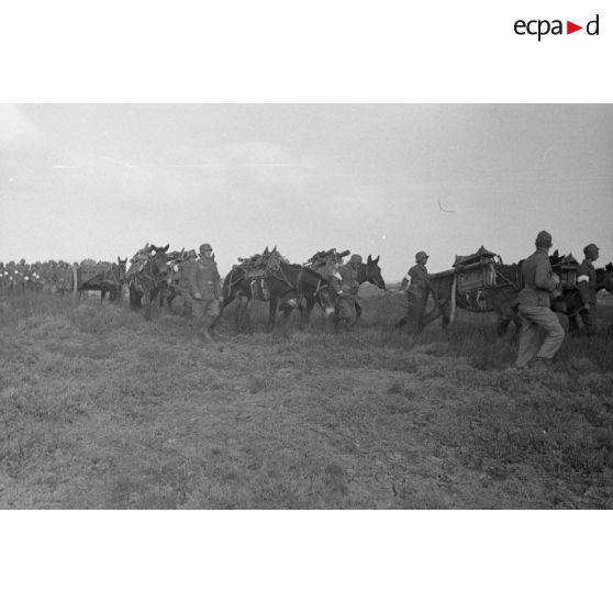 Volontaires guidant des mulets portant des mortiers Brandt de 81 mm sur des bâts.