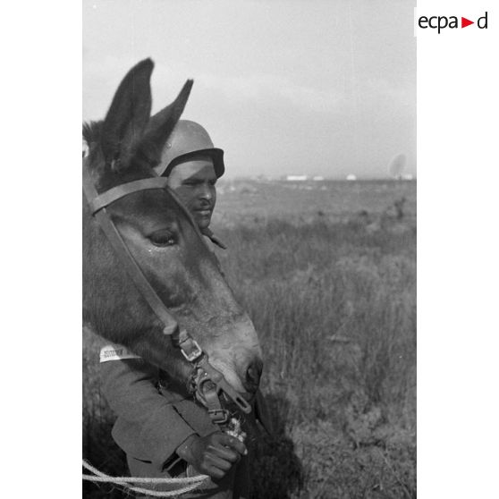 Un volontaire arabe tient un mulet par le licol.