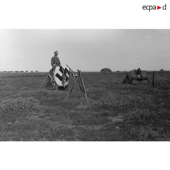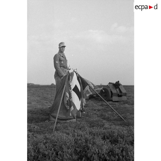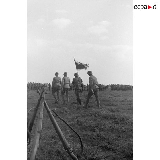 Un officier allemand fait une allocution depuis une tribune improvisée composée d'un drapeau à croix gammée et des fanions des unités.