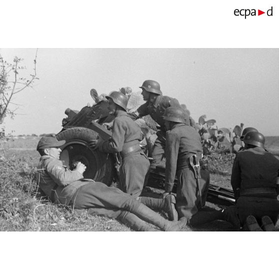 Entraînement des servants d'un canon de 7,5 cm LeIG-18 sous la direction d'un cadre allemand du Sonderverband-287 ou 288.