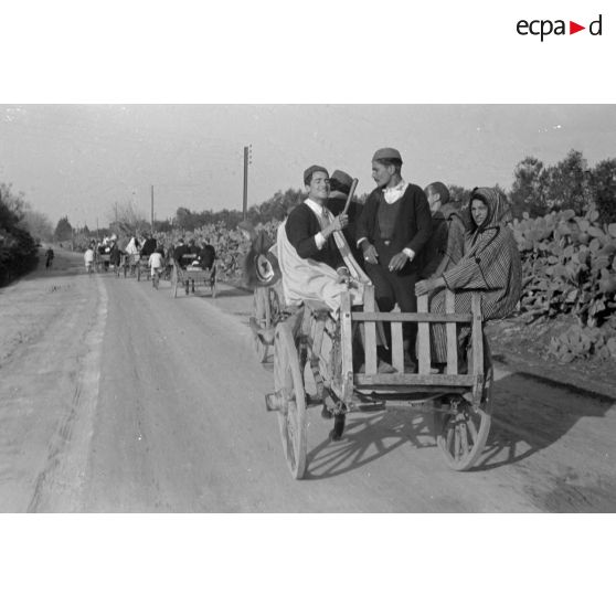 Sur une route, des civils en charrette ou à vélo arborent des drapeaux tunisiens.