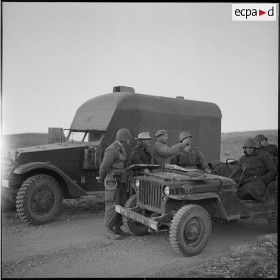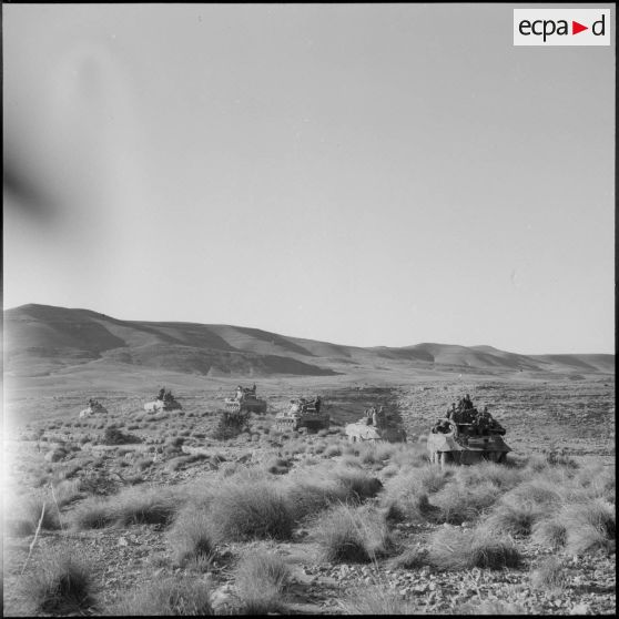Progression d'automitrailleuses Light Armored Car M8 dans un paysage désertique.