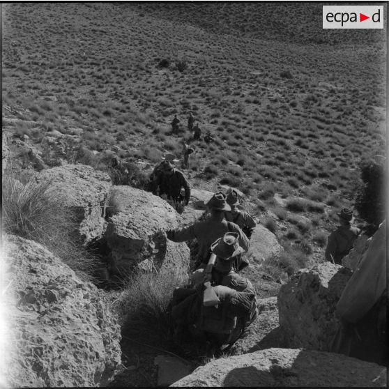 Un fantassin armé d'une carabine M-1en position de tir dans l'anfractuosité d'un rocher.