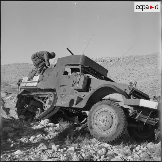 Plan serré de l'essieu avant d'un Half-track M9A1 endommagé.