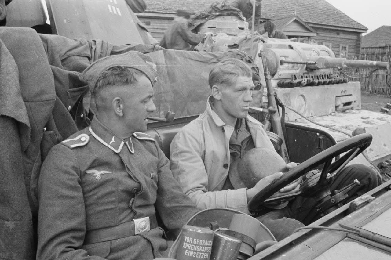 Deux sous-lieutenants devant un blindé Panzer-III de la 5.Panzer-Division, l'officier de gauche dépend du Leichte Flak Abteilung 71 (11.Panzer-Division).