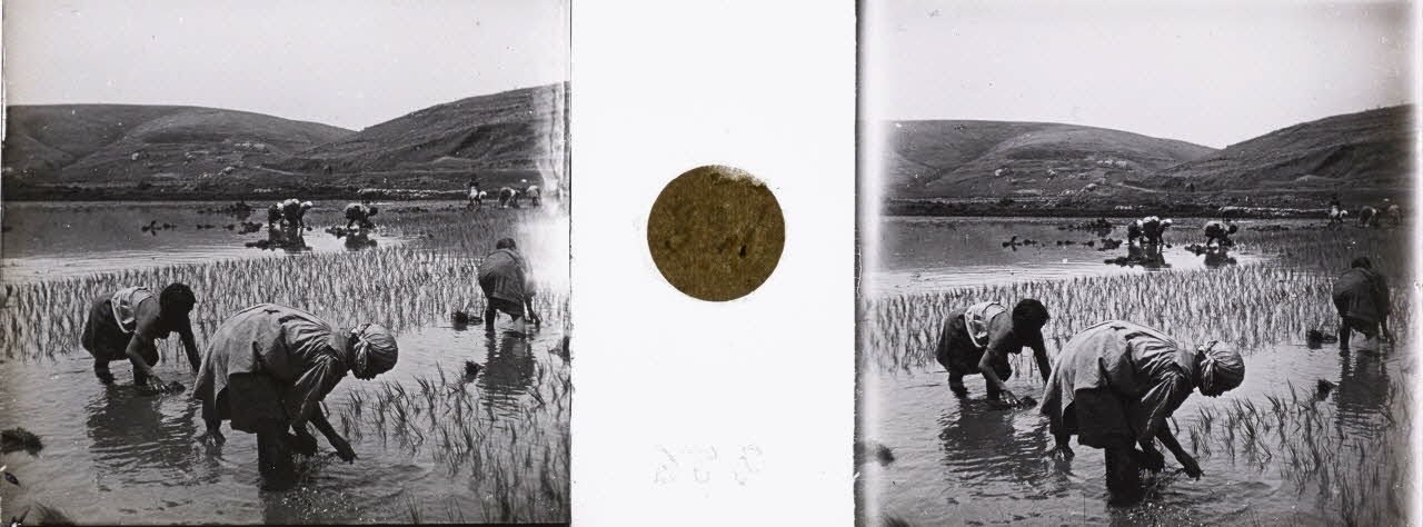 D68-31. Le riz est la nourriture de base à Madagascar. Les terrains favorables étant assez rares, les Malgaches ont recours aux cultures en terrasses. Vers novembre, les hommes labourent la terre à l'aide de leur longue bêche, l'engady. Après la saison des pluies, les femmes viennent repiquer une à une les pousses dans les rizières inondées. La récolte puis le battage des gerbes ont lieu en mars.