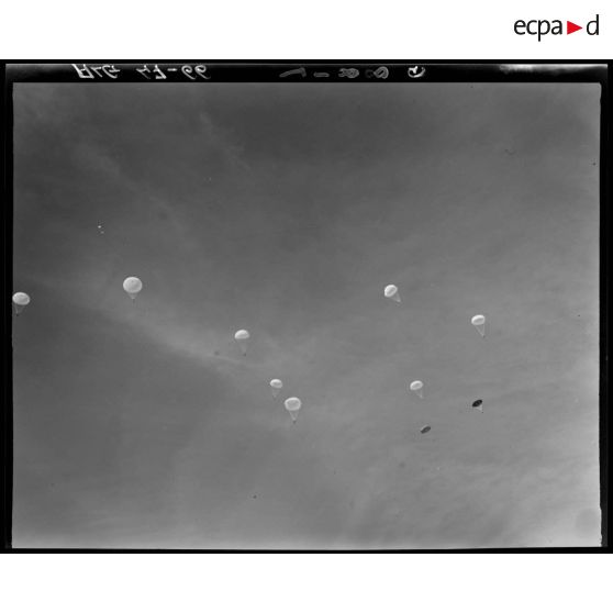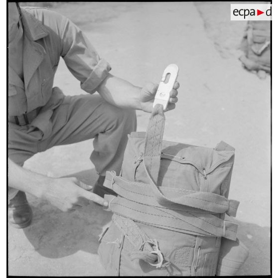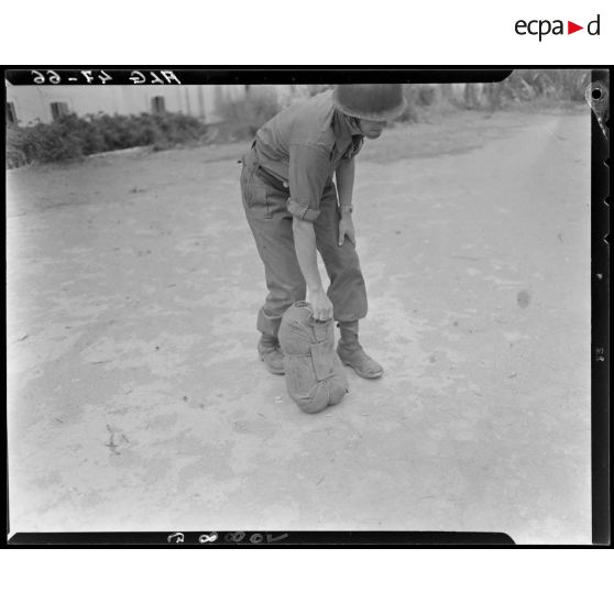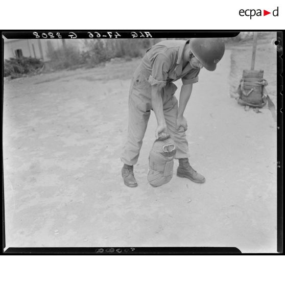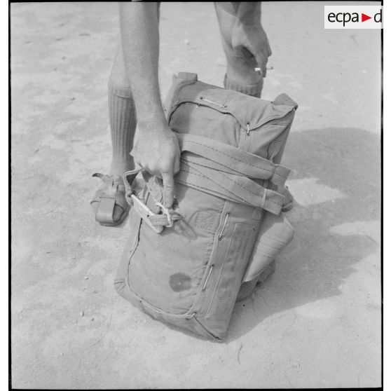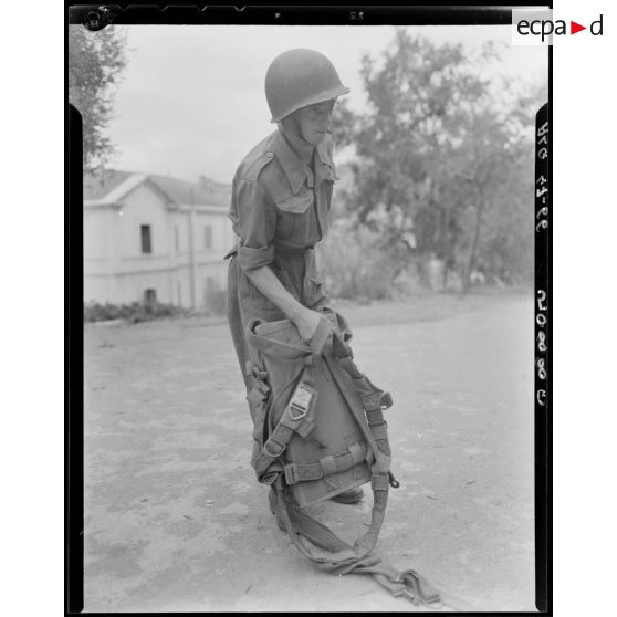 Un soldat de la 25e division alpine (DA) pose avec son parachute.