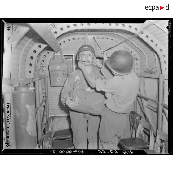 Un instructeur prépare un soldat de la 25e division alpine (DA) à un saut en parachute, à l'intérieur d'un avion.