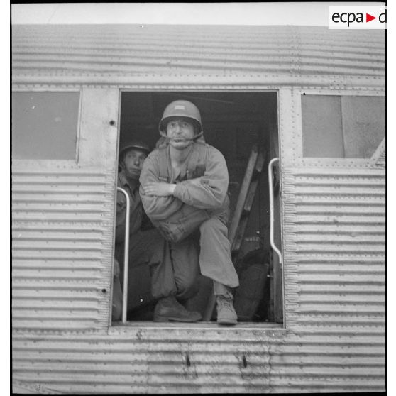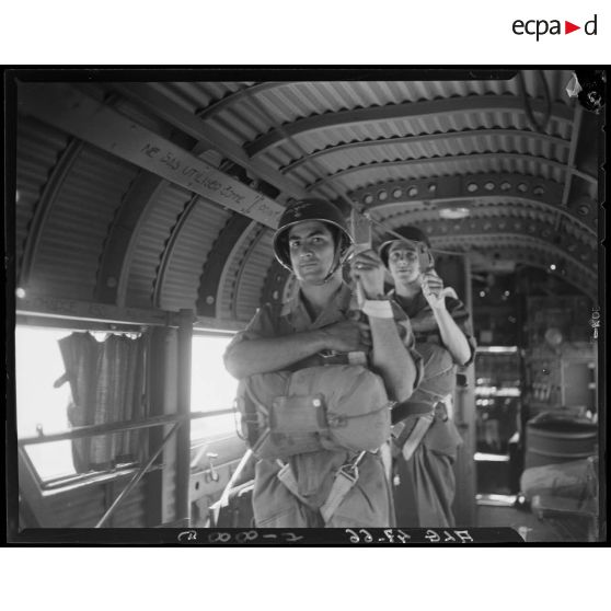 Deux soldats de la 25e division alpine (DA) se préparent à sauter en parachute, à l'intérieur d'un avion.