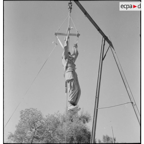 Un soldat de la 25e division alpine (DA) s'entraine au saut en parachute à l'aide d'une structure en bois.