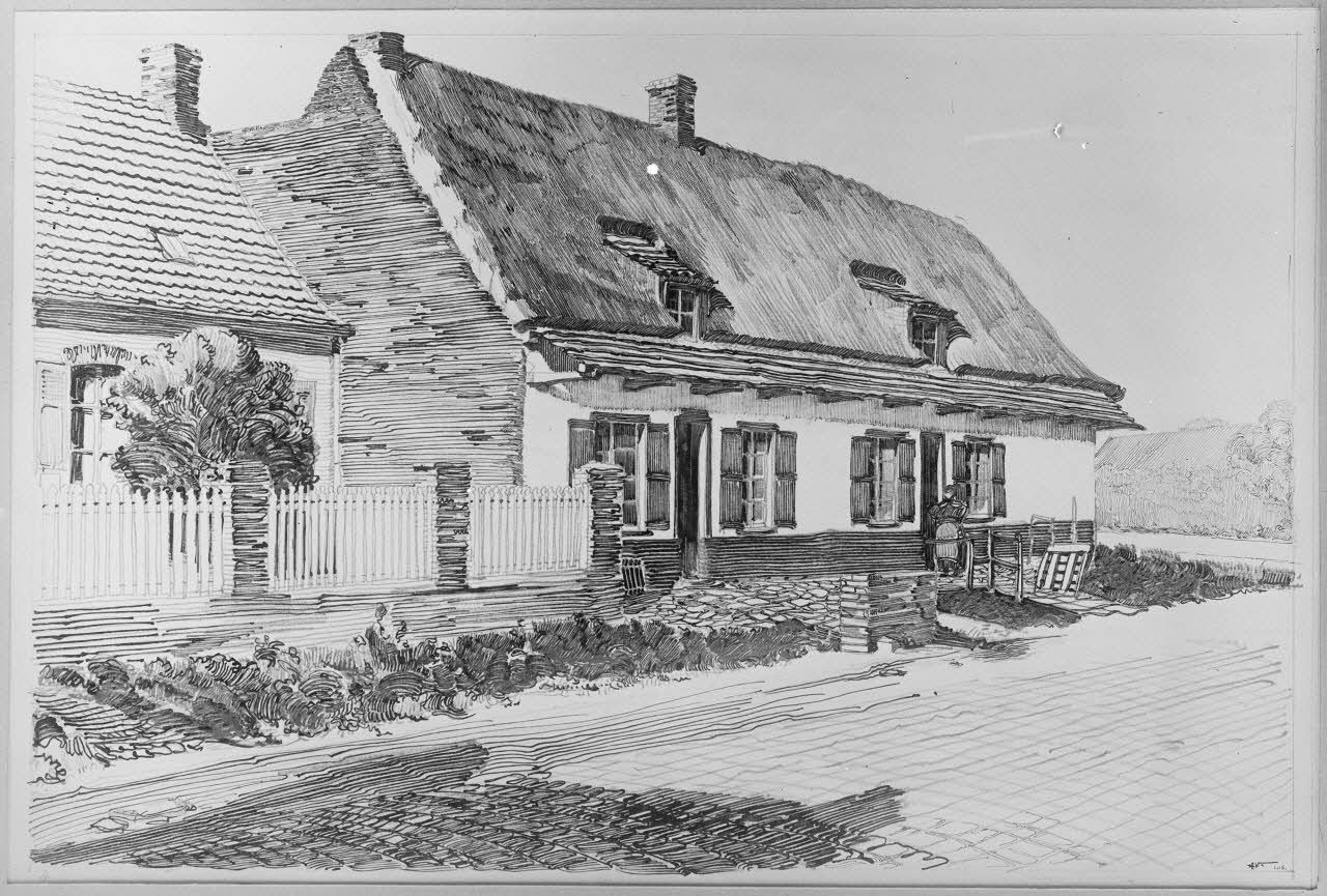 Reproduction de documents pour les Beaux-Arts. / Paris. Galerie de la rue de la Ville-l'Evêque. Concours pour la reconstruction d'habitations rurales, dans les départements envahis. Estaminet avec ferme dans les Flandres.