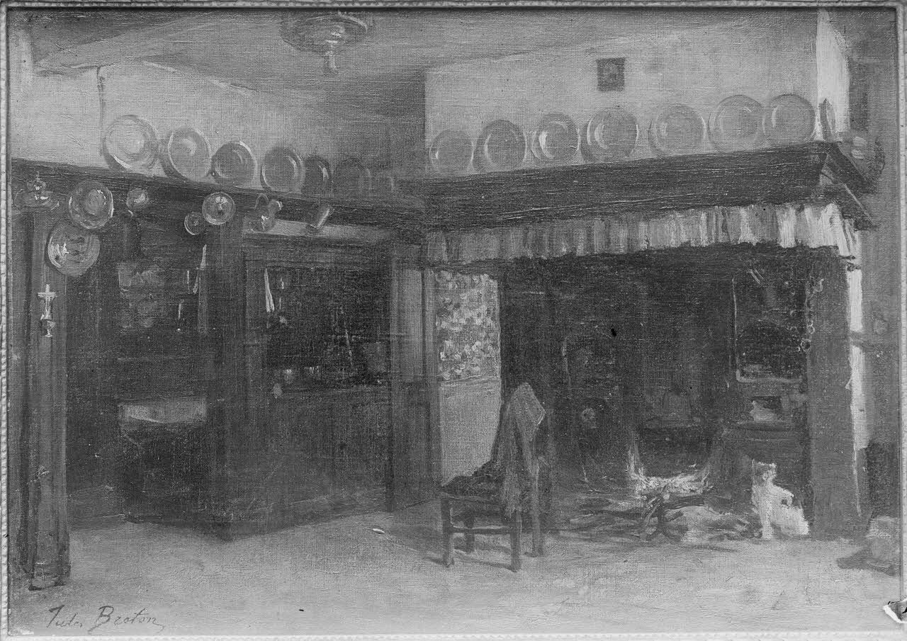 Reproduction de documents pour les Beaux-Arts. / Paris. Galerie de la rue de la Ville-l'Evêque. Concours pour la reconstruction d'habitations rurales dans les départements envahis. Intérieur d'habitation en ? par Jules Broton. [légende d’origine]
