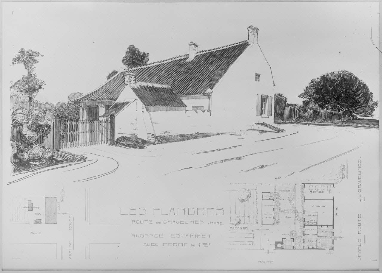 Reproduction de documents pour les Beaux-Arts. / Paris. Galerie de la rue de la Ville-l'Evêque. Concours pour la reconstruction d'habitations rurales, dans les départements envahis. Estaminet avec ferme dans les Flandres. [légende d’origine]