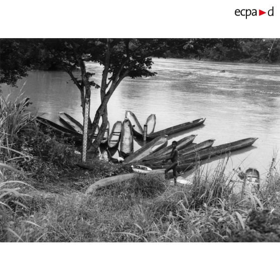République de Côte d'Ivoire, 1965. Barrage de la Bia. Pirogues.