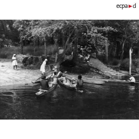 République Gabonaise, Lambaréné, 1943. L'embarcadère de l'hôpital Schweitzer sur l'Ogooué.