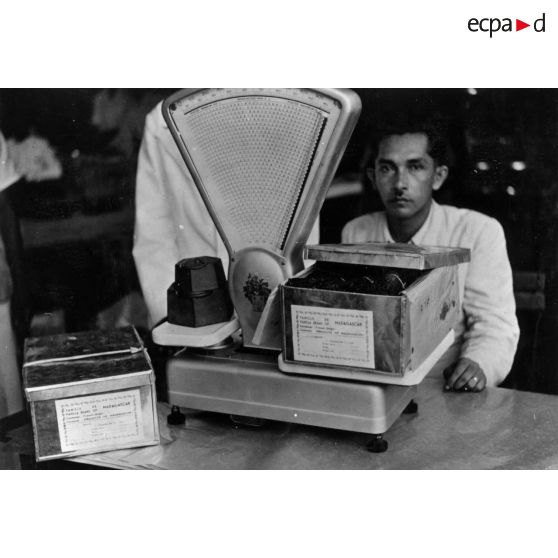 République malgache, 1952. Pesée des boites de vanille.