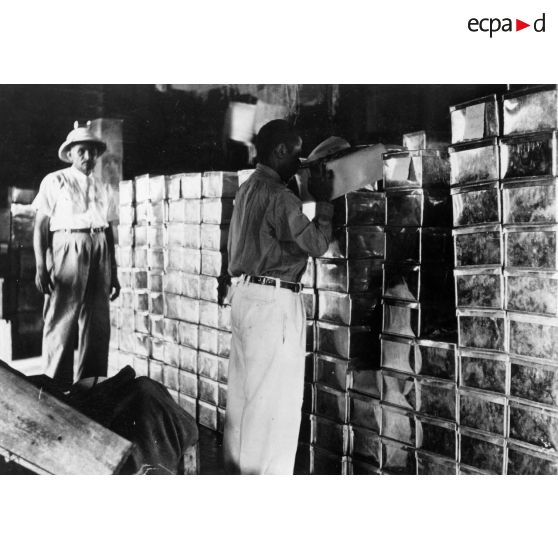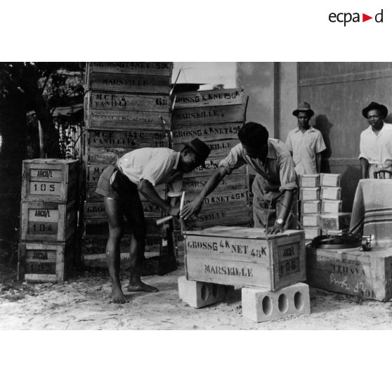 République malgache, 1952. Mise en entrepôt des caisses de vanille.