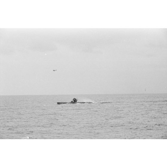 Un hydravion survole les sous-marins peu avant leur retour à Brest.