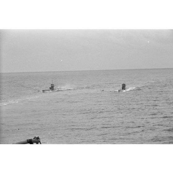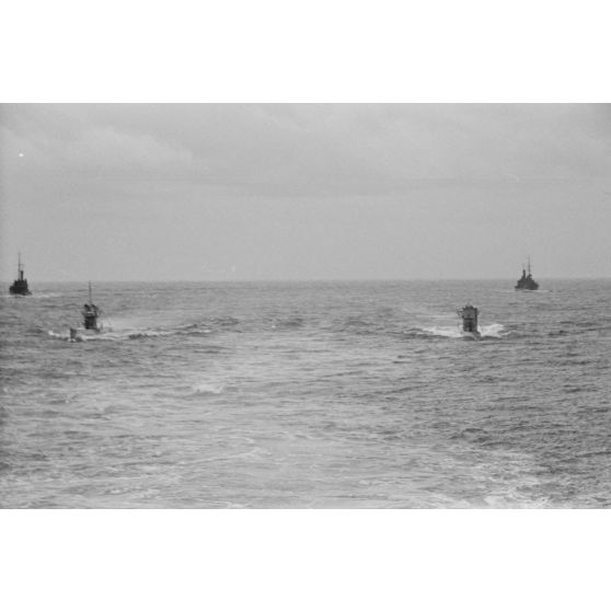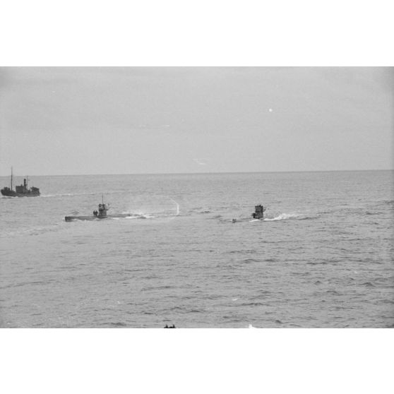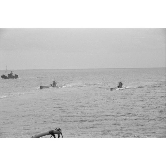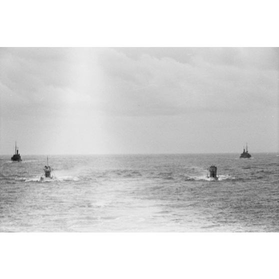 Retour de deux sous-marins, dont le U-83, photographiés depuis un briseur de blocus (Sperrbrecher).