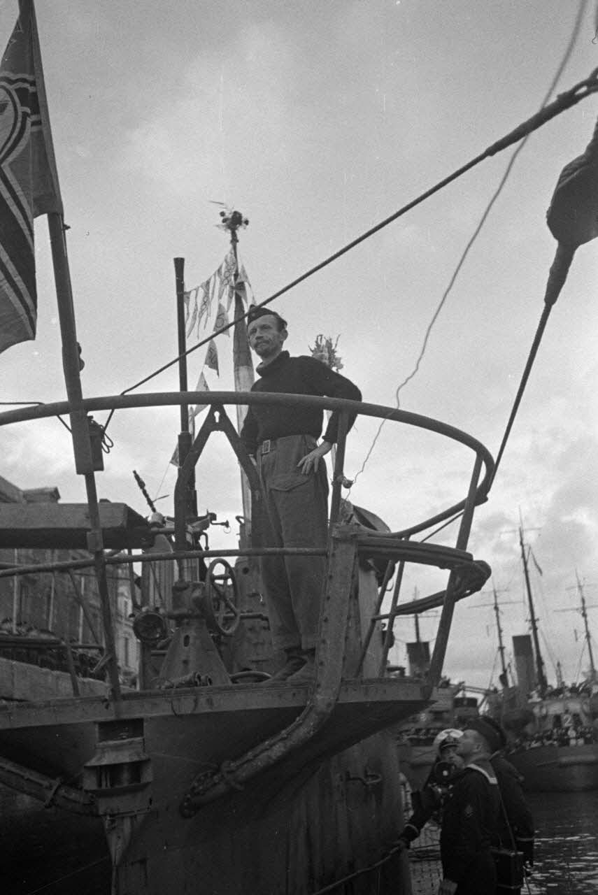 "Das Motiv aus der nationalsozialistischen Propaganda zeigt Korvettenkapitän Karl Thurmann (2.v.r., mit Bart) bei der Meldung nach der Rückkehr seines U-Bootes von einer Feindfahrt im Atlantik, herausgegeben im Oktober 1942. Die nationalsozialistische Berichterstattung schreibt am 18.10.1942 auf der Rückseite des Bildes: "Korvettenkapitän Thurmann von 'Ritterkreuzfahrt' zurück. Der Kommandant meldet dem Vertreter des Befehlshabers der Unterseeboote das erfolgreich zurückgekehrte Boot. Währenddessen haben sich die Kameraden des Stützpunktes an der Pier zur Begrüßung und dem Glückwunsch versammelt." Foto: Sammlung Berliner Verlag Archiv / Kramer.