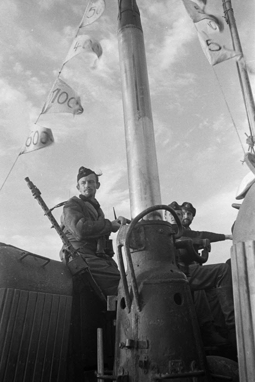 "Das Motiv aus der nationalsozialistischen Propaganda zeigt Korvettenkapitän Karl Thurmann (2.v.r., mit Bart) bei der Meldung nach der Rückkehr seines U-Bootes von einer Feindfahrt im Atlantik, herausgegeben im Oktober 1942. Die nationalsozialistische Berichterstattung schreibt am 18.10.1942 auf der Rückseite des Bildes: "Korvettenkapitän Thurmann von 'Ritterkreuzfahrt' zurück. Der Kommandant meldet dem Vertreter des Befehlshabers der Unterseeboote das erfolgreich zurückgekehrte Boot. Währenddessen haben sich die Kameraden des Stützpunktes an der Pier zur Begrüßung und dem Glückwunsch versammelt." Foto: Sammlung Berliner Verlag Archiv / Kramer.