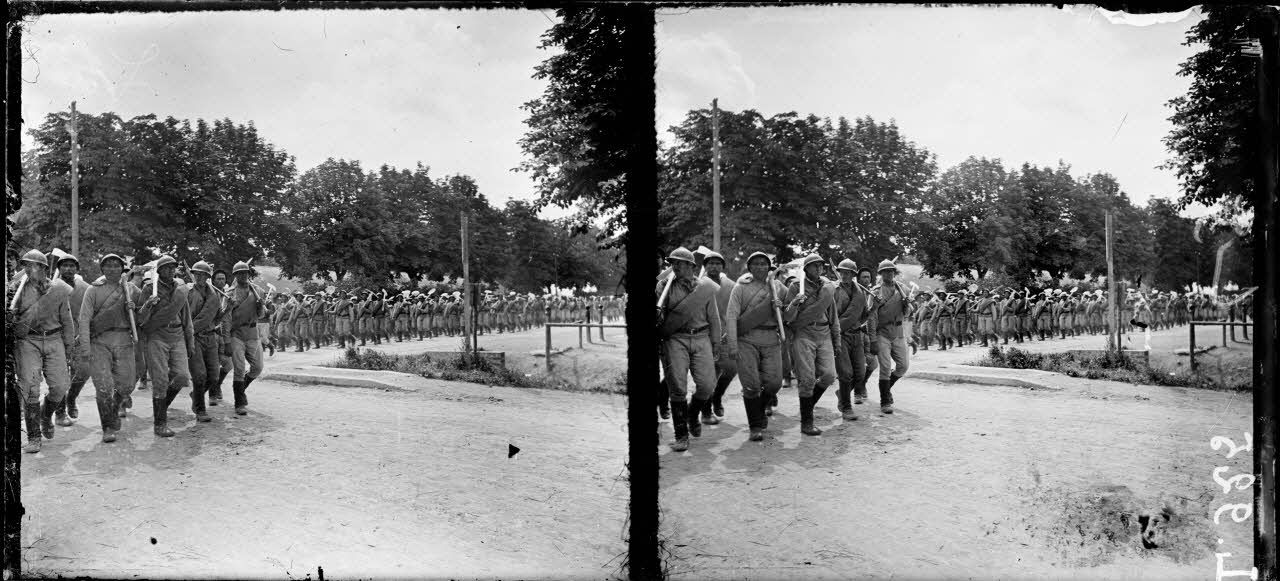 Retour au camp de Mourmelon de soldats russes venant de creuser des tranchées. [légende d'origine]
