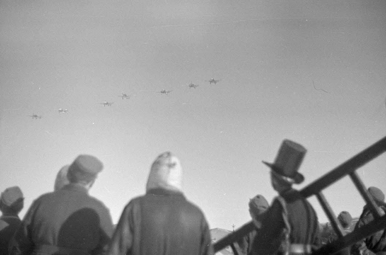 L'avion de Rudel se pose après sa 1 000e mission aérienne, un accueil particulier est réservé au pilote, le ramoneur est en tête du cortège.