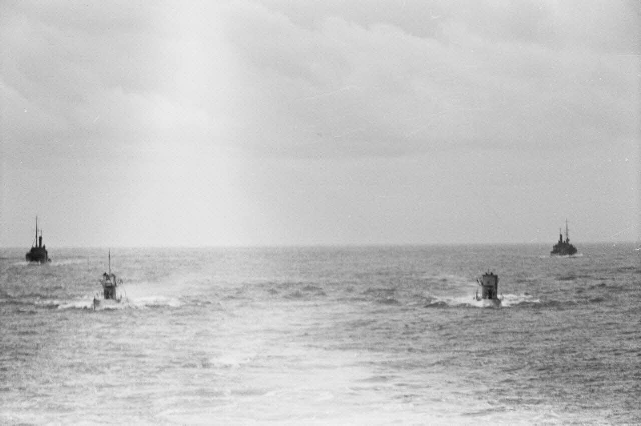 Retour de deux sous-marins, dont le U-83, photographiés depuis un briseur de blocus (Sperrbrecher).