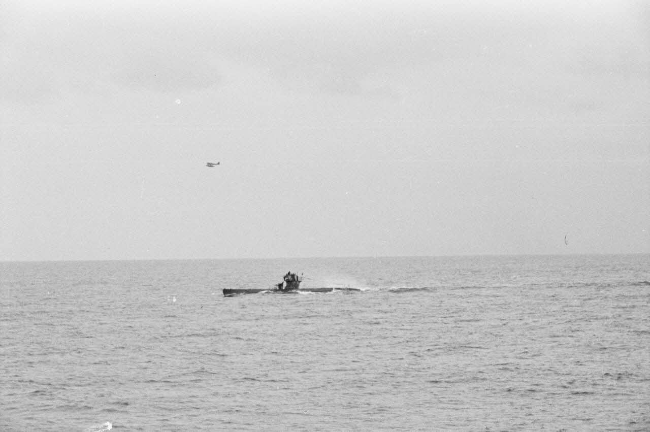 Un hydravion survole les sous-marins peu avant leur retour à Brest.