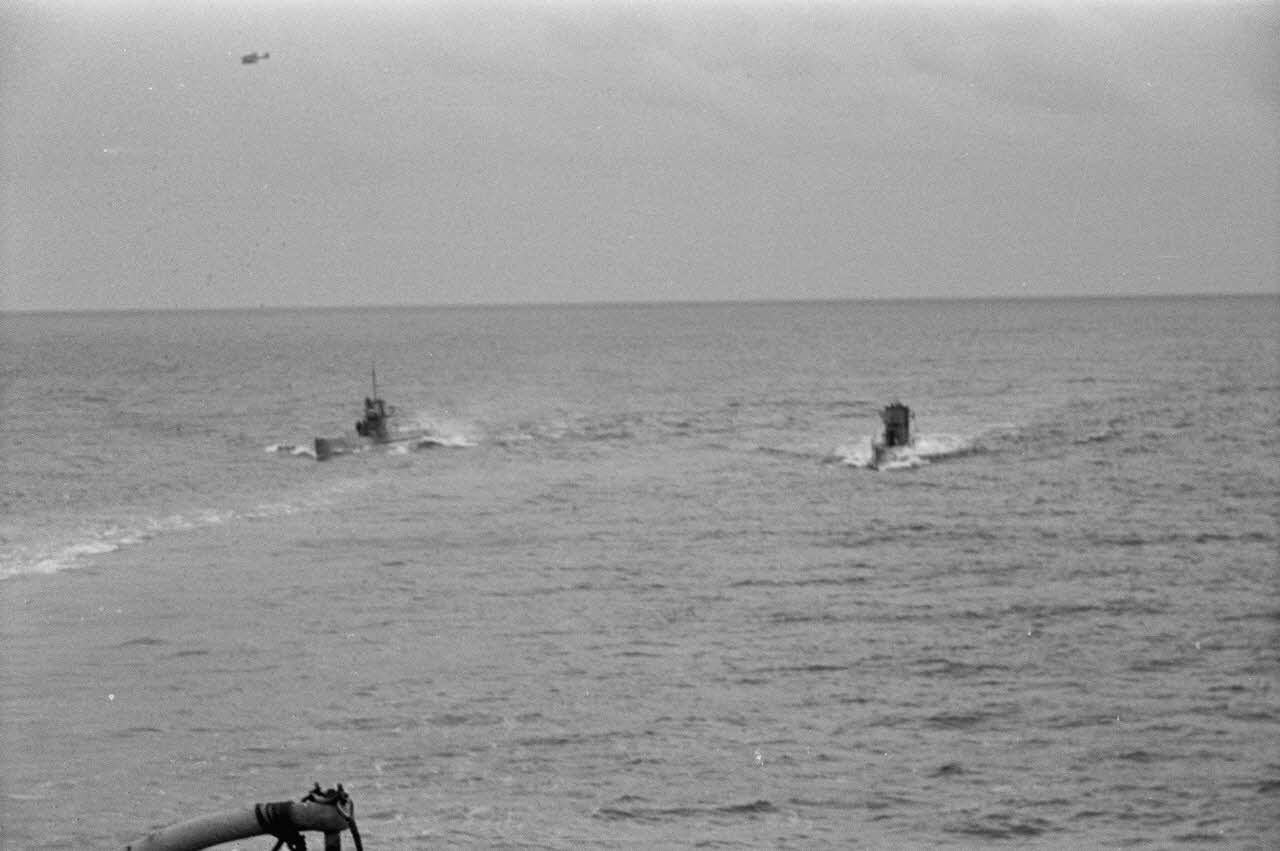 Un hydravion survole les sous-marins peu avant leur retour à Brest.