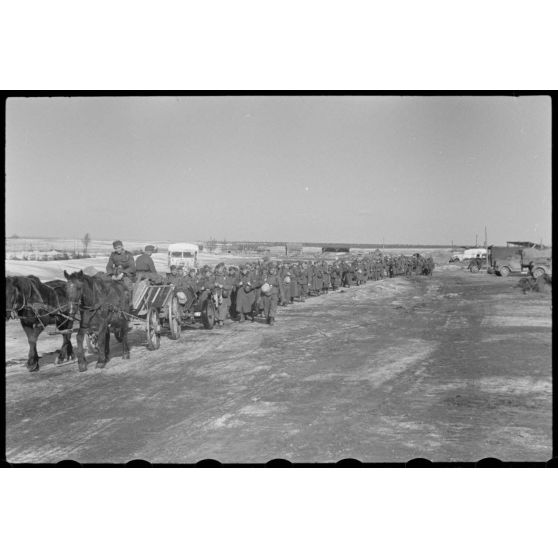 Retraite sur la route Wjasma-Smolensk de fantassins allemands et de prisonniers soviétiques lors de l'opération Büffelbewegung.