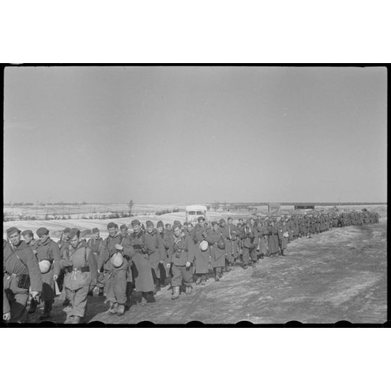 Lors de l'opération Büffelbewegung, la retraite de fantassins allemands sur la route Wjasma-Smolensk.