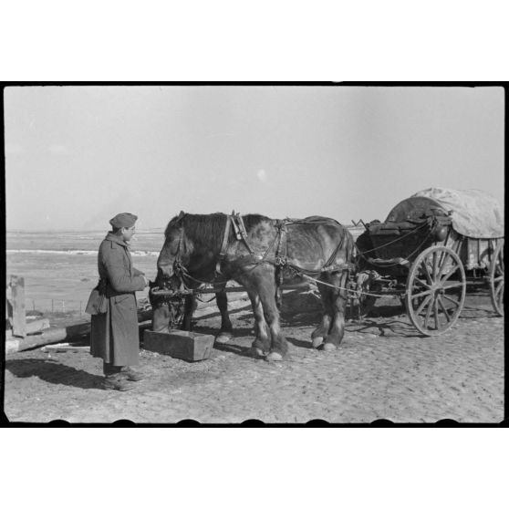 A l'ouest de Wjasma, lors de l'opération Büffelbewegung, des chevaux mangent après la traversée d'un pont.