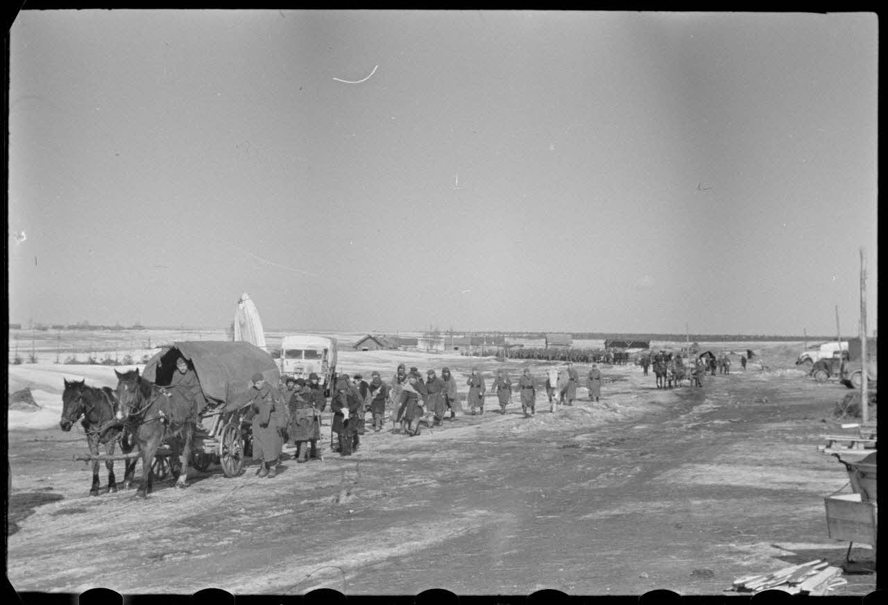 Retraite sur la route Wjasma-Smolensk de fantassins allemands et de prisonniers soviétiques lors de l'opération Büffelbewegung.