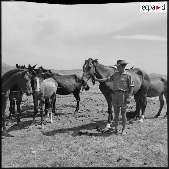 Un soldat du 4e RChC s'occupant des chevaux.