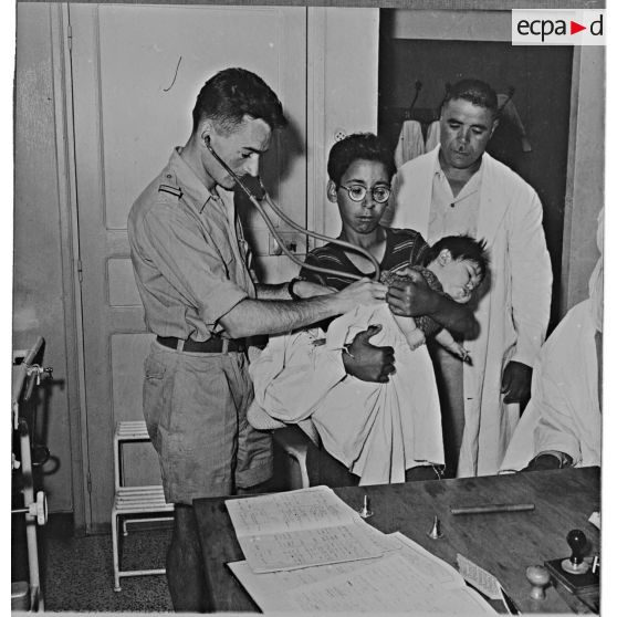 Le médecin militaire Vallet auscultant un nourrison au dispensaire du village d'Aïn Abid.