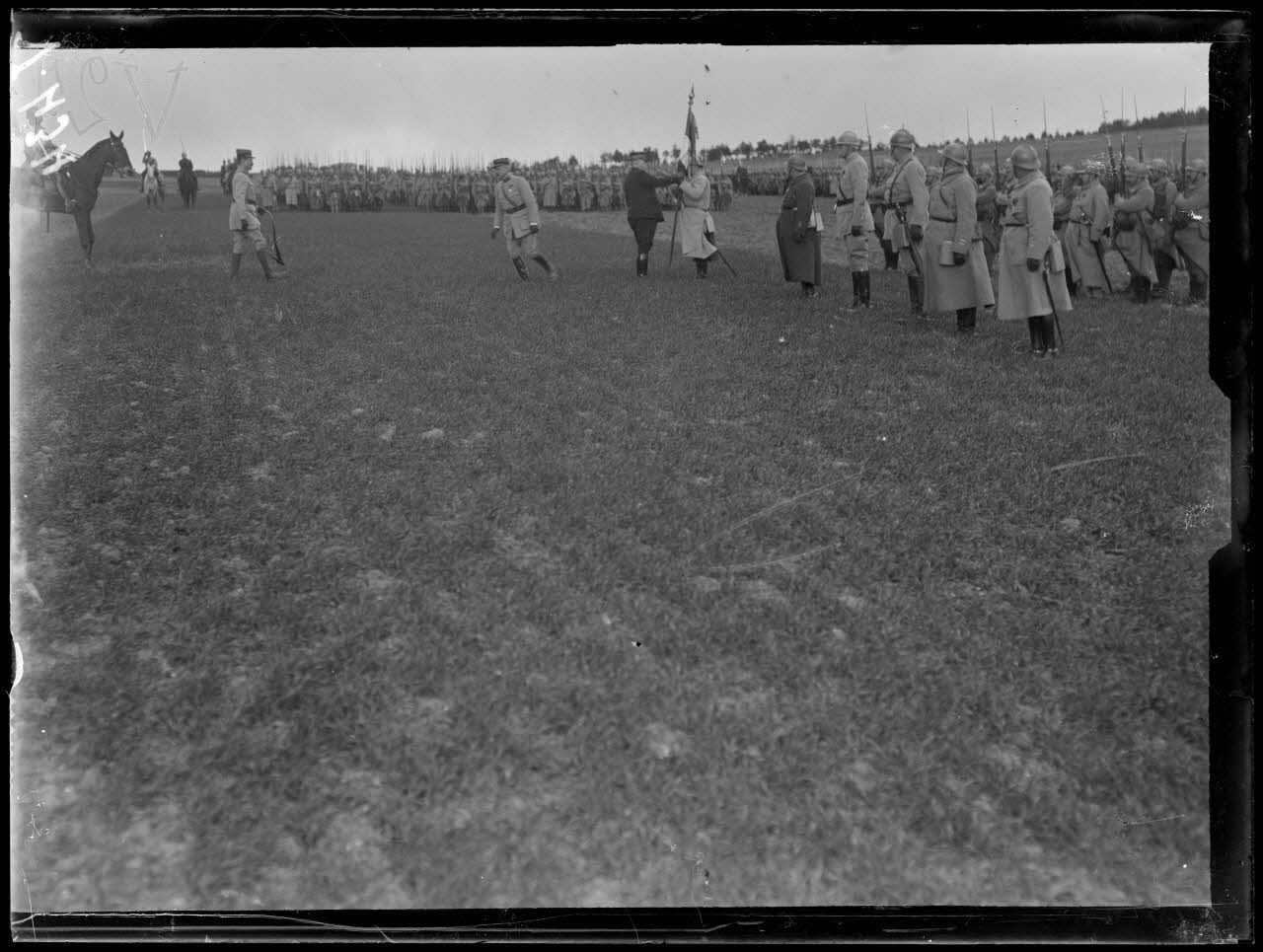 Revue passée par le général Joffre sur le terrain de la cote 176, en Champagne. Le général Joffre décore un drapeau.