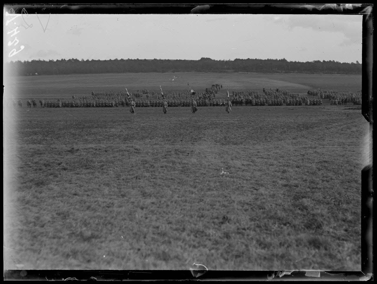 Revue passée par le général Joffre sur le terrain de la cote 176, en Champagne. Les troupes. [légende d'origine]